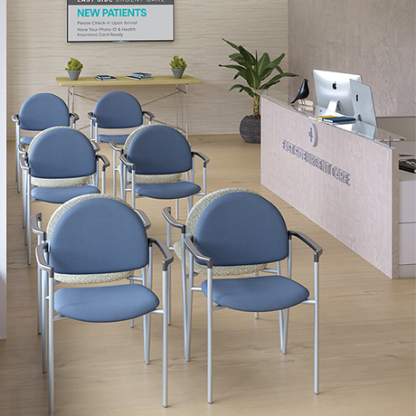 Chat stacker chair by Lesro Industries is available in combinations of upholstered and polypropylene back and seat configurations. Made of a fully welded steel tube construction, Chat has a wall-saver design and comes with or without arms or casters. Chairs can be stacked up to four high and feature a 300-400-pound
